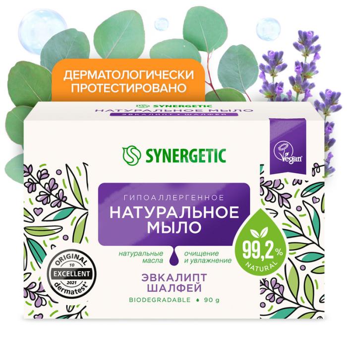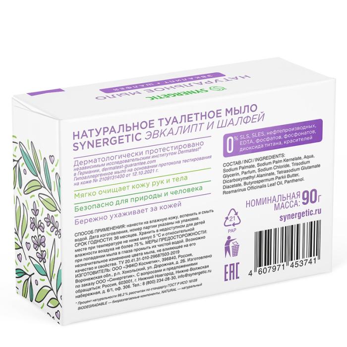 Натуральное кусковое туалетное мыло SYNERGETIC "Эвкалипт и шалфей" - средство для мягкого очищения и ухода за кожей рук и тела. Мыло имеет натуральную основу, изготовленную из растительных масел, которые бережно воздействуют на кожу, предохраняя от пересушивания при частом мытье рук. Натуральные эфирные масла и экстракты оказывают дополнительный уход и восстановление, а зелёные хелаты не наносят вред окружающей среде. Пантенол - незаменимый по эффективности компонент для защиты сухой и чувствительной кожи, он усиливает действие увлажняющих компонентов и способствует восстановлению барьерных функций. Парфюмерная композиция на основе натуральных эфирных масел эвкалипта и шалфея оставляет на коже нежный аромат.