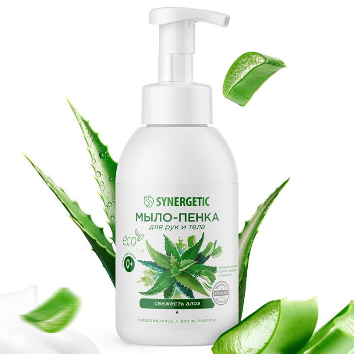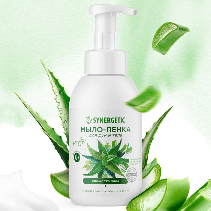 Мягкое жидкое мыло-пенка для рук и тела SYNERGETIC Свежесть алоэ на основе натуральных компонентов бережно очищает кожу и оставляет свежий аромат алоэ. Сок алоэ вера интенсивно увлажняет, смягчает и восстанавливает чувствительную кожу, делая ее мягкой и бархатистой. Бисаболол успокаивает и помогает восстановить барьерные функции кожи. Мультифункциональный компонент натурального происхождения софоролипид обладает регенерирующим действием, мягко очищает и сохраняет естественный микробиом кожи. Гипоаллергенное мыло с физиологичным уровнем pH 5,5 безопасно при частом использовании. Нежная воздушная пенка не сушит кожу, подходит для людей с чувствительной кожей и детей с первых дней жизни. Мыло дерматологически протестировано независимым исследовательским институтом Dermatest® в Германии. Средство не содержит SLES, силиконов, красителей, минеральных масел, компонентов животного происхождения, не тестируется на животных и сертифицировано британской организацией The Vegan Society. Знак Vegan – мировой стандарт этичной продукции.