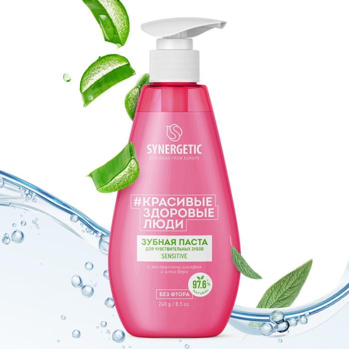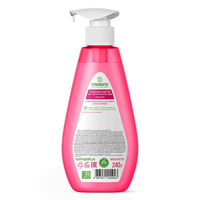 Зубная паста SYNERGETIC для чувствительных зубов SENSITIVE - безопасная и эффективная паста без фтора, которая бережно очищает и укрепляет зубную эмаль, препятствует образованию налета и снижает чувствительность зубов. Гидроксиапатит - это основная минеральная составляющая эмали зубов. В зубной пасте он применяется как активный элемент, который реминерализует, восстанавливает и укрепляет зубную эмаль. Остальные активные компоненты в этом продукте - эффективные и безопасные лактат кальция и цитрат цинка. Они отвечают за насыщение эмали кальцием, уменьшение образования зубного налета и предотвращение развития зубного камня. Бисаболол - особый компонент зубных паст для чувствительных десен. Он успокаивает, снижает чувствительность и устраняет дискомфорт. Ксилит уменьшает количество кариесогенных бактерий и восстанавливает кислотно-щелочной баланс, а экстракты алоэ вера и кокоса прекрасно отбеливают, не разрушая эмаль. Ментол и экстракт шалфея обеспечивают длительную свежесть дыхания. При регулярном применении зубная паста возвращает улыбке белизну, заботясь о чувствительных деснах и эмали. Формула не содержит мела, фтора, SLES, сахарина, триклозана, диоксида титана. Удобный формат флакона обеспечивает экономичный расход, а значит при ежедневном использовании зубной пасты хватит надолго.