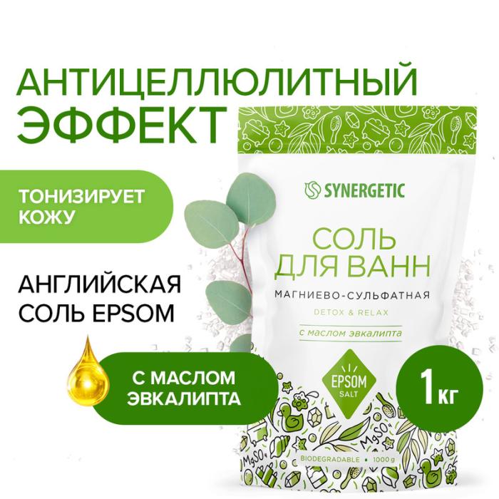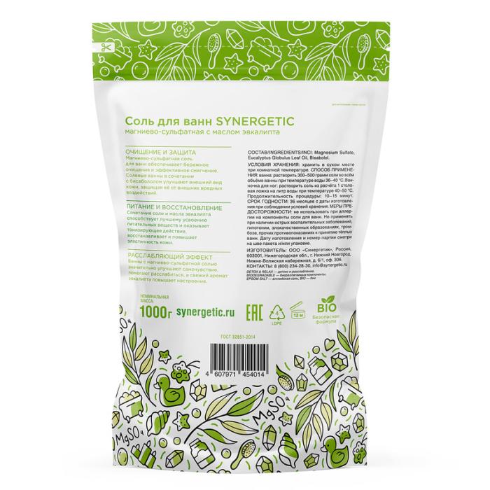 Магниево-сульфатная соль для ванн SYNERGETIC - это безопасная формула с высоким содержанием сульфата магния. Растворяясь в воде, он проникает в тело через поры кожи и хорошо усваивается организмом. Натуральная магниево-сульфатная соль для ванн обеспечивает бережное очищение и эффективное смягчение. Солевые ванны в сочетании с бисабололом улучшают внешний вид кожи, защищая ее от внешних вредных воздействий. Сочетание соли и масла эвкалипта способствует лучшему усвоению питательных веществ и оказывает тонизирующее действие, восстанавливает и повышает эластичность кожи. Ванны с магниево-сульфатной солью значительно улучшают самочувствие, помогают расслабиться, а свежий аромат эвкалипта повышает настроение. Теплая ванна с магниево-сульфатной солью SYNERGETIC - это прекрасный способ восстановить силы и насытить организм полезными минералами.