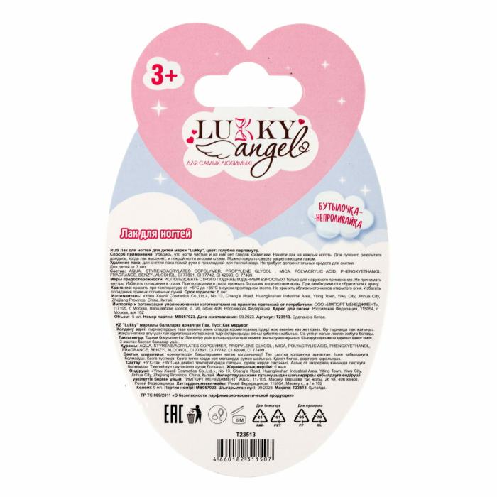 Лак для ногтей Lukky Angel сделан на водной основе, мгновенно сохнет, ложится тонким и ярким слоем и смывается водой. А еще очень вкусно пахнет. Просто опусти ноготки в теплую воду и смой лак. Не требует дополнительных средств для снятия. Бутылочка непроливайка не даст лаку разлиться, а щадящая формула легко отстирывается с одежды. Lukky Angel – для самых любимых!