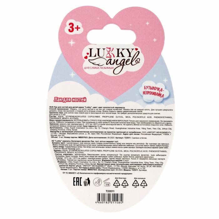 Лак для ногтей Lukky Angel сделан на водной основе, мгновенно сохнет, ложится тонким и ярким слоем и смывается водой. А еще очень вкусно пахнет. Просто опусти ноготки в теплую воду и смой лак. Не требует дополнительных средств для снятия. Бутылочка непроливайка не даст лаку разлиться, а щадящая формула легко отстирывается с одежды. Lukky Angel – для самых любимых!