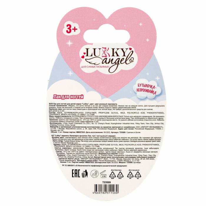 Лак для ногтей Lukky Angel сделан на водной основе, мгновенно сохнет, ложится тонким и ярким слоем и смывается водой. А еще очень вкусно пахнет. Просто опусти ноготки в теплую воду и смой лак. Не требует дополнительных средств для снятия. Бутылочка непроливайка не даст лаку разлиться, а щадящая формула легко отстирывается с одежды. Lukky Angel – для самых любимых!