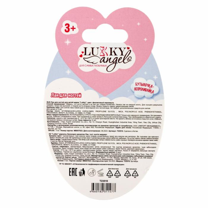 Лак для ногтей Lukky Angel сделан на водной основе, мгновенно сохнет, ложится тонким и ярким слоем и смывается водой. А еще очень вкусно пахнет. Просто опусти ноготки в теплую воду и смой лак. Не требует дополнительных средств для снятия. Бутылочка непроливайка не даст лаку разлиться, а щадящая формула легко отстирывается с одежды. Lukky Angel – для самых любимых!