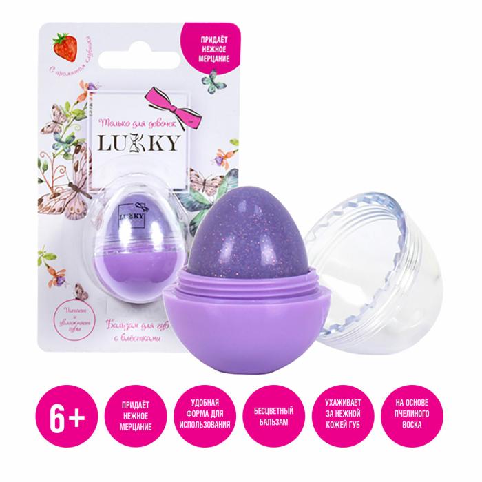 Бальзам для губ с блёстками LUKKY Яйцо Сиреневая дымка с ароматом клубники — настоящий подарок для нежной кожи. Это бальзам для губ увлажняющий, который защитит кожу от сухости, трещин, сделает мягкой, гладкой и напитанной.