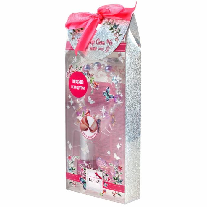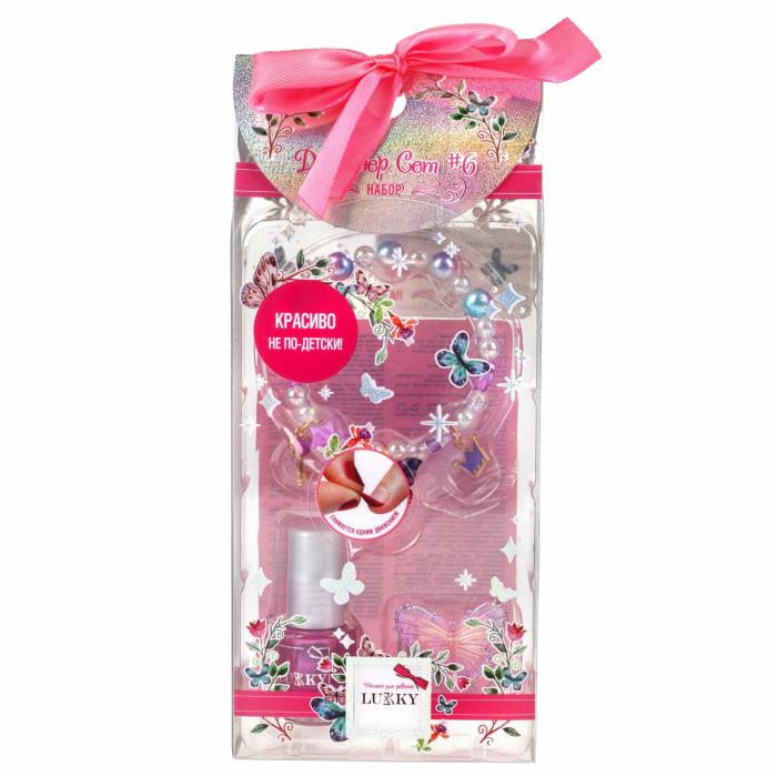Набор Дизайнер Сет #7 от Lukky – это истинное волшебство для маленькой леди, мечтающей о стильных украшениях и модных ноготках. в набор входит: лак для ногтей детский, браслет и колечко. Лак для ногтей на водной основе не только выглядит превосходно, но и создан специально для малышек. Детский лак для ногтей абсолютно безопасен, легко снимается, словно пленка. Его яркий цвет порадует юную модницу и придаст ей неповторимый стиль. В комплект входит изысканный браслет, украшенный великолепными шармами – ключиком, обещающим открыть сокровищницу секретов, бабочкой, символизирующей красоту, и короной, напоминающей о королевском происхождении маленькой обладательницы. Дополняет образ колечко, украшенное бабочкой – загадочным и игривым символом, который делает аксессуар по-настоящему незабываемым. Каждый элемент набора "Lukky Дизайнер Сет #7" тщательно подобран, чтобы воплотить детские мечты в реальность и подарить радость самовыражения. Это идеальный подарок, который развивает вкус к красоте и дарит безграничные возможности для творчества. Подходит для детей старше 5-ти лет.