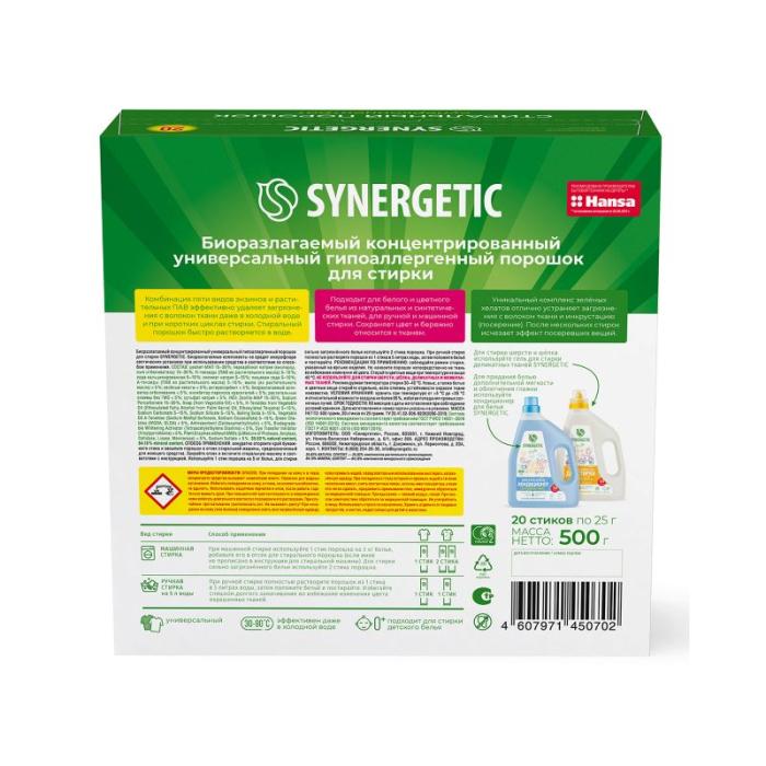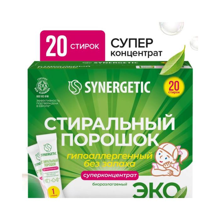 Стиральный порошок SYNERGETIC - экологичный, безопасный, универсальный, гипоаллергенный и эффективный суперконцентрат в стиках. Комбинация пяти видов энзимов и растительных ПАВ эффективно удаляет загрязнения с волокон ткани даже в холодной воде и при коротких циклах стирки. Стиральный порошок быстро растворяется в воде. Уникальный комплекс зеленых хелатов отлично устраняет загрязнения с волокон ткани и инкрустацию (посерение). После нескольких стирок исчезает эффект посеревших вещей. Эффективность средства подтверждена в Европе. Подходит для белого и цветного белья из натуральных и синтетических тканей, для ручной и машинной стирки. Сохраняет цвет и бережно относится к тканям. Порошок не содержит фосфатов, фосфонатов, акрилатов, агрессивных ПАВ, SLS, SLES, ЭДТА, красителей, ароматизаторов, оптических отбеливателей. Подходит для стирки детского белья 0+ и легко выполаскивается из тканей. Международный экологический сертификат ICEA подтверждает биоразлагаемость, безопасность и эффективность средства. Биоразлагаемые компоненты не вредят микрофлоре септических установок при использовании средства в соответствии со способом применения. Экономичный и практичный формат стика удобен не только при использовании дома, но и для путешествий любым видом транспорта.