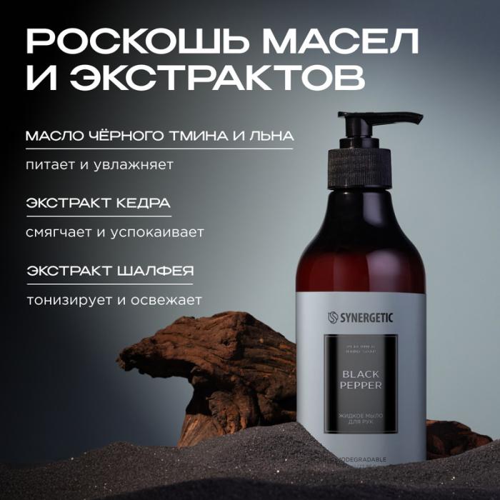 Жидкое мыло для рук SYNERGETIC black pepper/черный перец бережно очищает кожу и оставляет на ней пряный аромат с восточным характером. Уникальный комплекс натуральных компонентов обеспечивает длительный смягчающий эффект и способствует восстановлению липидного слоя кожи. Масла чёрного тмина и льна смягчают и питают, а экстракты кедра и листьев шалфея успокаивают и помогают сохранить эластичность и упругость кожи, придавая ей здоровый и ухоженный вид. Мультифункциональный компонент натурального происхождения софоролипид мягко очищает и сохраняет естественный микробиом кожи. Насыщенная и глубокая парфюмерная композиция с восточным характером, который раскрывается элегантностью и чувственностью чёрного перца, мускусными оттенками амбры и пряными нотами специй. В сердце букета – выраженные лесные и дымно-древесные вкрапления, которые словно источают аромат смолистой коры старого тысячелетнего дерева и придают аромату теплоту и соблазнительность. Аромат создаёт уверенное и энергичное настроение, пробуждает силу и страсть, вдохновляет на смелые, авантюрные и захватывающие моменты.