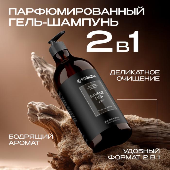 Парфюмированный гель-шампунь 2 в 1 для мужчин SYNERGETIC "SAVAGE MEN" с экстрактами кедра, конского каштана и лимона бережно очищает волосы, кожу головы и тела, укрепляет, увлажняет и тонизирует, надолго оставляя на коже дерзкий бодрящий аромат. Физиологичный уровень pH 5,5 гарантирует мягкость кожи и безопасность при частом использовании даже для чувствительной кожи. Средство не содержит SLES, силиконов, красителей и минеральных масел. Роскошная и дерзкая парфюмерная композиция представляет собой сочетание свежих цитрусовых оттенков и глубоких древесно-пряных нот, которые придают ей характерную мужественность и харизму. Ноты терпкого бергамота, сочного мандарина и слегка кисловатой сливы создают яркое и свежее начало. Сердце состоит из бархатистых мотивов сандала, лаванды и пикантного сычуаньского перца. Шлейфовые ноты благородного дерева, сладких бобов тонка и ванили формируют глубокий и тёплый финальный аккорд, который оставляет длительное приятное послевкусие. Аромат, словно сочетание живой энергии, интригующей сложности и успокаивающей глубины, превращает каждый вдох в незабываемое путешествие.