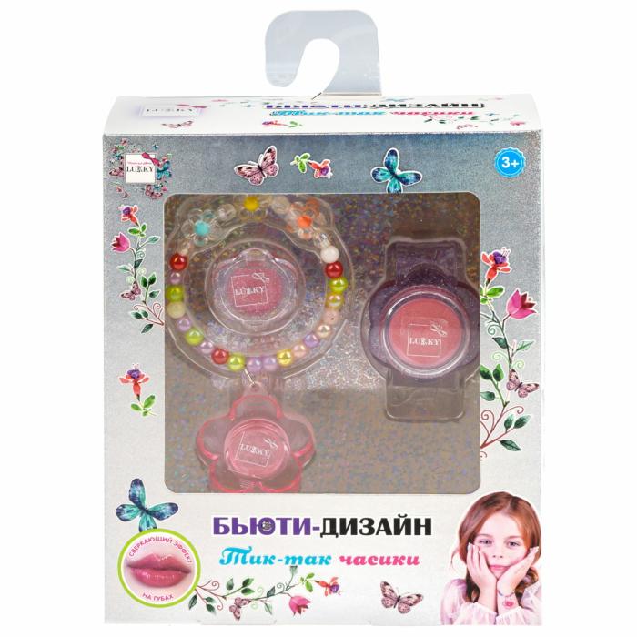 Набор детской декоративной косметики из коллекции Бьюти Дизайн Тик-так часики от бренда Lukky — это оригинальный комплект в форме стильных аксессуаров для маленьких любительниц красоты. В набор входят бальзам для губ в упаковке в виде часов на браслете, блеск в миниатюрной сумочке и кулон-бальзам в форме цветка на бусинках.