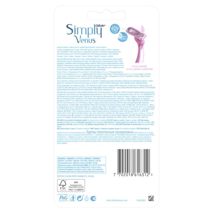 Женская одноразовая бритва Gillette Venus Simply3 создана для бережного удаления ненужных волосков. Одноразовые бритвы для женщин Venus Simply 3 в упаковке из двух штук обеспечивают гладкое бритье по доступной цене, вызывая меньше раздражения. (По сравнению с Venus Simply 2). Преимущества: плавающая головка с тремя лезвиями повторяет контуры тела и обеспечивает точное и гладкое бритье с каждым движением; три более острых по сравнению с Simply Venus 2; благодаря увлажняющей полоске MoistureRich бритва легко скользит по коже, вызывая меньше раздражения (по сравнению с Simply Venus 2); прорезиненная комфортная пластиковая ручка обеспечивает невероятный контроль и не выскользнет даже в душе. Защитные микропластины оригинального станка Gillette Venus Simply3 сокращают количество порезов и царапин. Не требует смены кассет, просто замените бритву. Наслаждайтесь гладким и комфортным бритьем!
