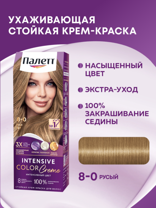 Благодаря тройной системе ухода стойкая крем-краска для волос Палетт обеспечивает бережное окрашивание. С аммиаком. Комплекс с Кератином, Пантенолом и Аргановым маслом проникает глубоко в структуру волоса, восстанавливая, увлажняя и питая его изнутри. Активные вещества оказывают смягчающее и укрепляющее воздействие, делая волосы гладкими и блестящими.