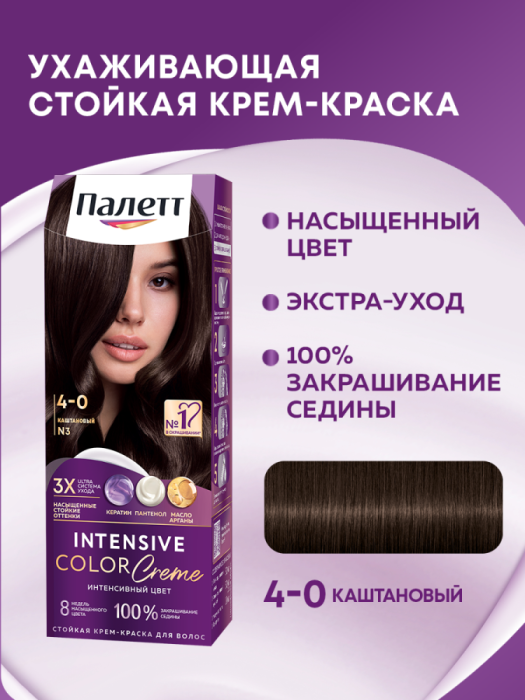 Благодаря тройной системе ухода стойкая крем-краска для волос Палетт обеспечивает бережное окрашивание. С аммиаком. Комплекс с Кератином, Пантенолом и Аргановым маслом проникает глубоко в структуру волоса, восстанавливая, увлажняя и питая его изнутри. Активные вещества оказывают смягчающее и укрепляющее воздействие, делая волосы гладкими и блестящими.