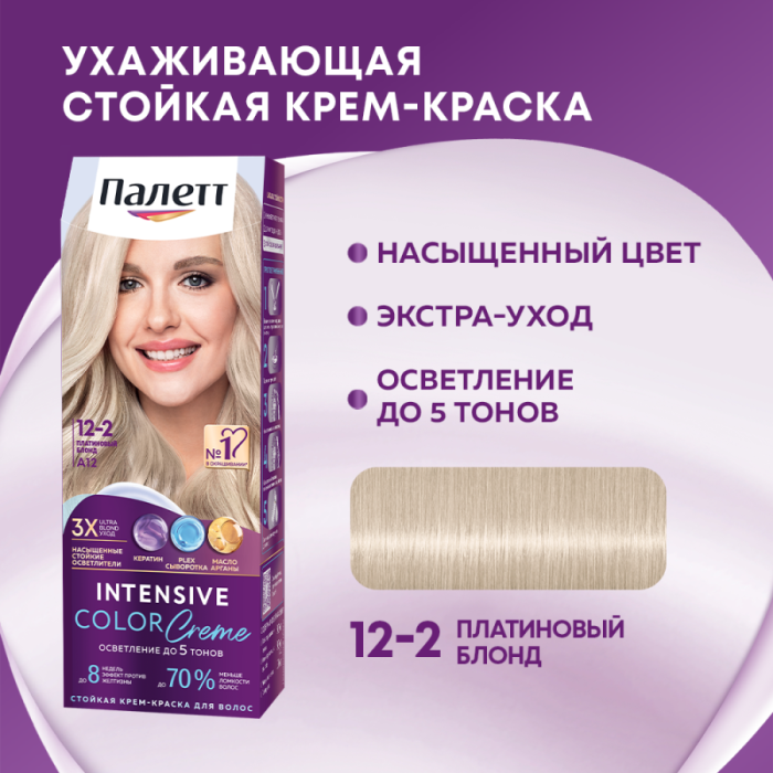 Благодаря тройной системе ухода стойкая крем-краска для волос Палетт обеспечивает бережное окрашивание. С аммиаком. Комплекс с Кератином, Пантенолом и Аргановым маслом проникает глубоко в структуру волоса, восстанавливая, увлажняя и питая его изнутри. Активные вещества оказывают смягчающее и укрепляющее воздействие, делая волосы гладкими и блестящими.