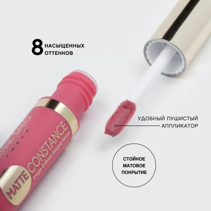 Благодаря входящим в состав силиконовым маслам помада Matte Constance обеспечивает устойчивый матовый эффект в сочетании с невесомым покрытием.
