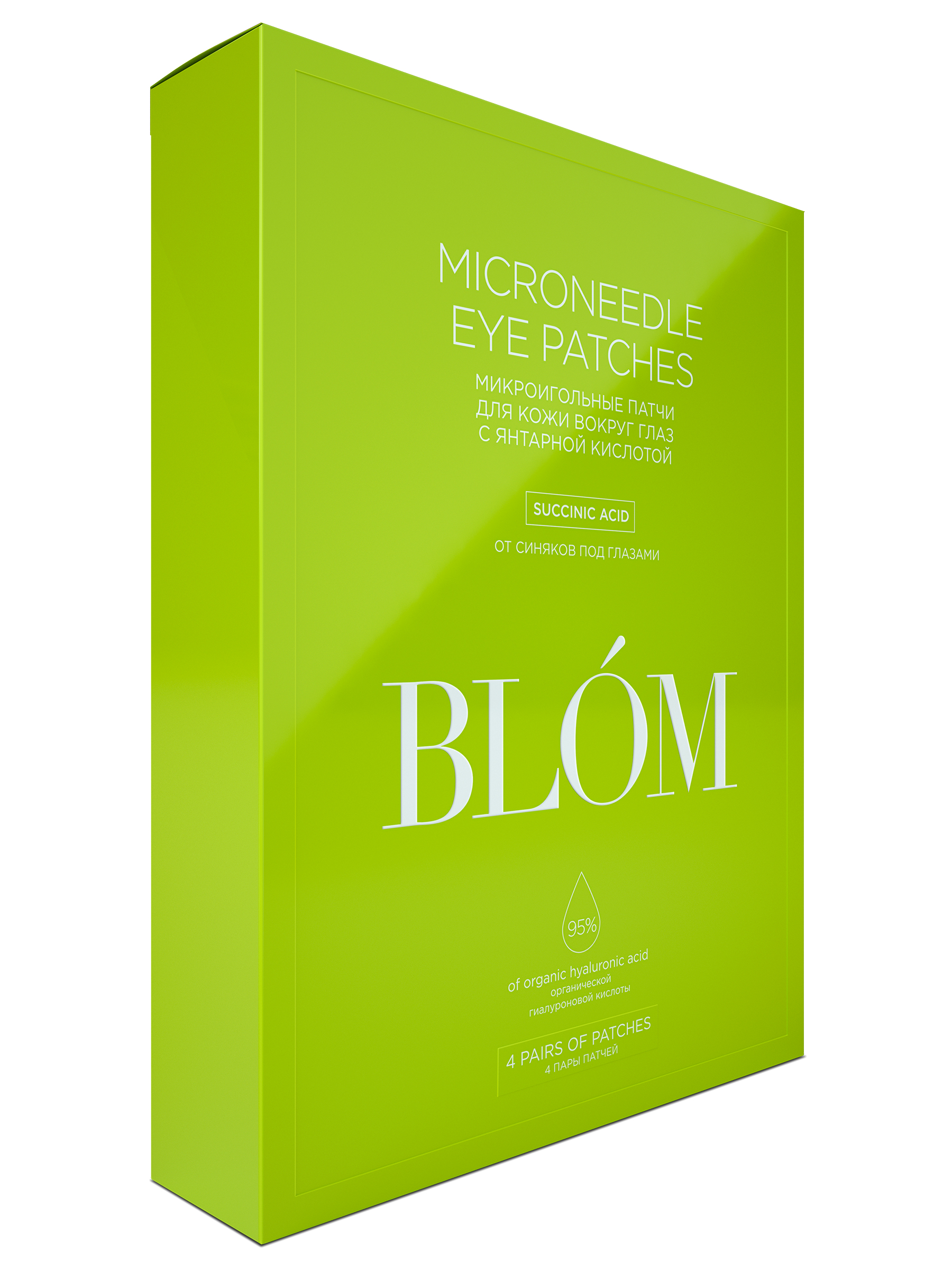 Микроигольные патчи для кожи вокруг глаз с янтарной кислотой от синяков под глазами. Патчи BLÓM — будущее вашей кожи. Запатентованная микроигольная технология патчей (патент RU№2652567, приоритет на патент США №32735812) позволяет доставлять гиалуроновую и янтарную кислоты до базальной мембраны кожи, обеспечивая 5 действий против синяков под глазами: улучшение микроциркуляции, ускорение метаболизма кожи, повышение плотности дермы, выравнивание микрорельефа, нормализация барьерной функции кожи. Высокая плотность расположения гиалуроновых игл (100 шт. на 1 см2) обеспечивает эффективность патчей. Наилучший эффект достигается при прохождении курса 4-6 применений с промежутком 48 часов. Микроиглы не содержат консервантов, отдушек и красителей, силиконов, минеральных масел и выраженных аллергенов.