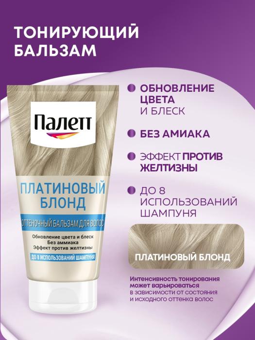 Оттеночный бальзам для волос Палетт для идеального блонда без эффекта желтизны. Благодаря обновлению цвета и уходу в перерывах между осветлением волосы выглядят здоровыми и ухоженными. Оттеночный бальзам Пепельный блонд придает пепельный оттенок светлым волосам. Подходит для волос от самого светлого до средне-русого оттенка.