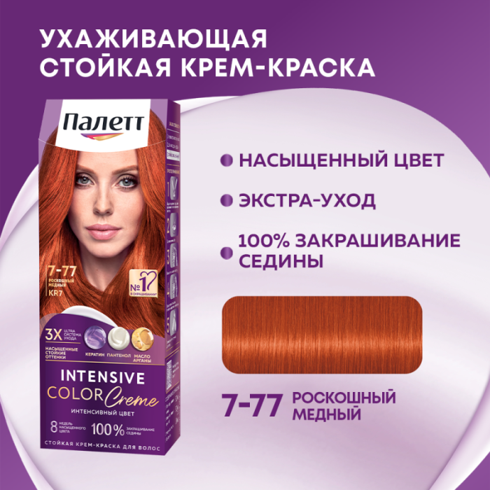 Благодаря тройной системе ухода стойкая крем-краска для волос Палетт обеспечивает бережное окрашивание. С аммиаком. Комплекс с Кератином, Пантенолом и Аргановым маслом проникает глубоко в структуру волоса, восстанавливая, увлажняя и питая его изнутри. Активные вещества оказывают смягчающее и укрепляющее воздействие, делая волосы гладкими и блестящими.