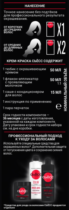 Стойкая крем-краска для волос СЬЁСС – это профессиональное окрашивание, доступное для использования дома. Концентрированные цветовые пигменты глубоко проникают в волокна волоса, а система против повреждений с ухаживающей PLEX-технологией профессионально восстанавливает структурные связи волоса. Формула с кератином покрывает кутикулу волос, делая их более мягкими и гладкими.