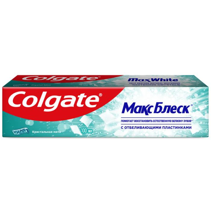 Отбеливающая зубная паста Colgate Макс Блеск 100 мл с отбеливающими пластинками помогает восстановить естественную белизну зубов*, а также придает свежесть дыханию для еще большей уверенности в себе.