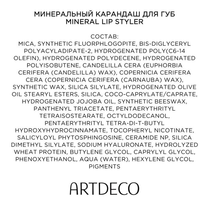 Совершенствуй макияж губ с помощью Mineral Lip Styler! Карандаш легко, точно и равномерно наносится и вы без проблем создадите идеальный контур. Насыщенный цвет и чрезвычайно стойкая формула также идеальна для заполнения губ внутри контура. Результат: ваша помада держится дольше, а губы выглядят полнее. Специально разработанная формула с минералами бережно ухаживает за нежной кожей губ и предотвращает сухость, защищает от внешних факторов и подходит для чувствительных губ. Mineral Lip Styler имеет встроенную точилку, а наконечник полностью выдвигается, что делает его идеальным для путешествий. Содержит гиалуроновую кислоту, которая увлажняет кожу, канделийский воск для мягкой кремовой текстуры и слюду для шелковистого сияния.