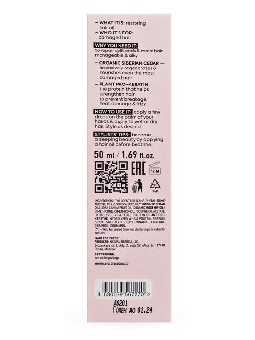 ОРГАНИЧЕСКОЕ МАСЛО СИБИРСКОГО КЕДРА – регенерирует повреждённые волосы, укрепляет кутикулу и делает ее более блестящей.