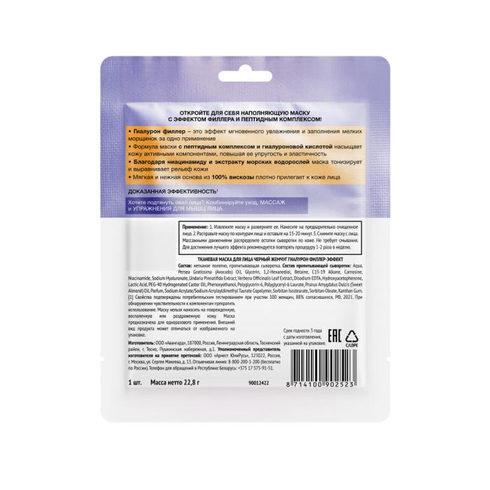 Тканевая маска Черный Жемчуг Гиалурон филлер-эффект мгновенно увлажняет и заполняет мелкие морщинки за одно применение! Тканевая маска Черный Жемчуг Гиалурон филлер-эффект: ● обеспечивает филлер-эффект; ● увлажняет и тонизирует; ● масло авокадо; ● выравнивает тон и рельеф; ● повышает упругость и эластичность. Основа из 100% вискозы плотно прилегает к коже лица.