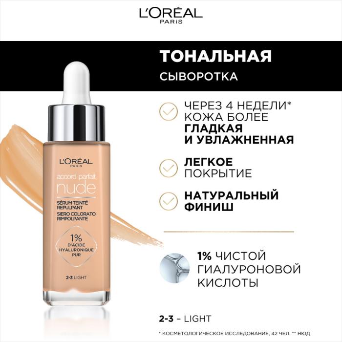 ACCORD PARFAIT NUDE - первая гиалуроновая тональная сыворотка с рекордным содержанием чистой гиалуроновой кислоты 1%. Мгновенно выравнивает тон кожи, как тональное средство и повышает упру гость кожи как сыворотка. Легкое покрытие и сияние здоровой кожи. Молекула гиалуроновой кислоты заполняет морщины изнутри, и уже через 6 недель использования кожа становится более гладкой и упру гой, а морщинки заметно сокращены. Вся сила сыворотки с гиалуроновой кислотой теперь в тональном средстве! Доступно в 4-х оттенк