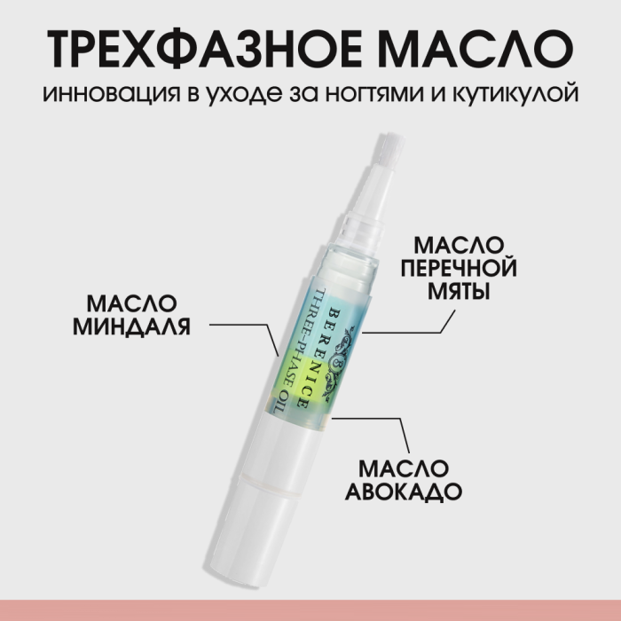 Трехфазная технология масла, разработанная для питания ногтей и наполнения их влагой. Коктейль из минерального масла, масла миндаля и авокадо, с ароматом мяты. Масло увлажняет и реабилитирует ваши высушенные ногти и кутикулу.