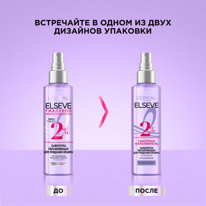 Увлажняющая сыворотка "Гиалурон Наполнитель", обогащенная 2% системой ухода с ГИАЛУРОНОВОЙ КИСЛОТОЙ, интенсивно увлажняет, увеличивая волосы в диаметре до 9%*, придавая им более объемный вид без утяжеления.