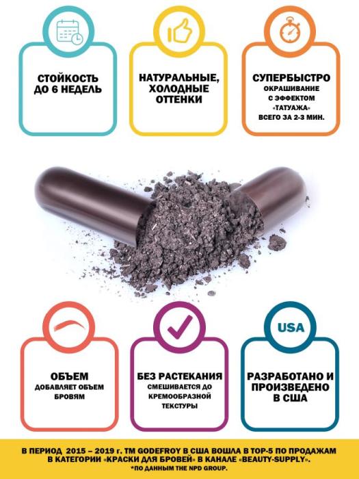 Набор не содержит осксидант. Для окрашивания рекомендуем использовать оксидант Godefroy. Бровь должна быть чистая, сухая. При необходимости удаляйте макияж средствами, которые не содержат масел. Перед процедурой окрашивания бровей, сделайте мягкое скрабирование, благодаря чему краситель даст более длительный эффект татуажа. Обезжирить брови спиртосодержащим средством. Откройте капсулу с пигментом (сухими руками, прокручивающими движениями). Рекомендуем использовать 1/4 часть капсулы, этого более чем достато