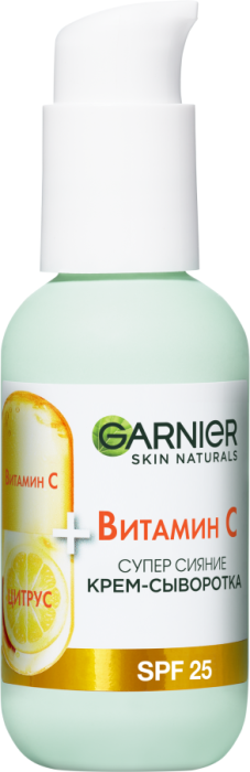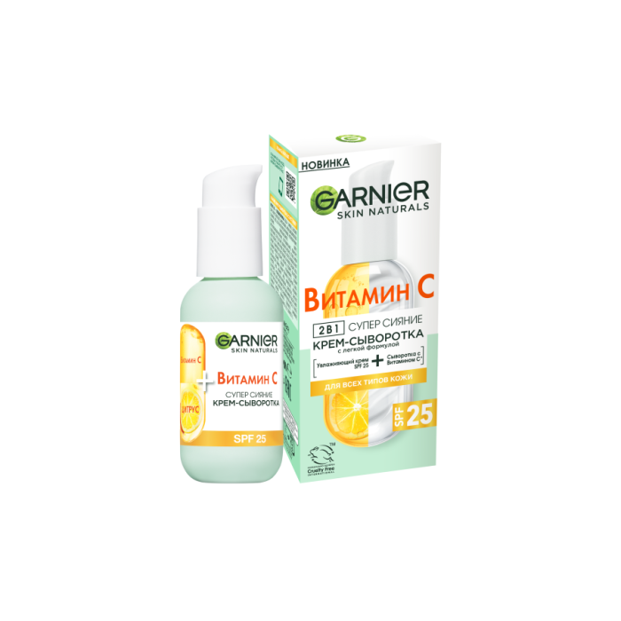 Средство для ухода: 2 в 1, насыщенное 20%-ной сывороткой, обогащенной [Витамином С*.] Крем-сыворотка с легкой формулой действует одновременно как сыворотка и как увлажняющий крем.