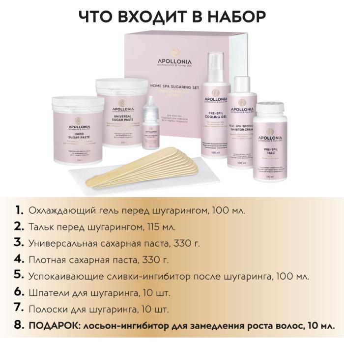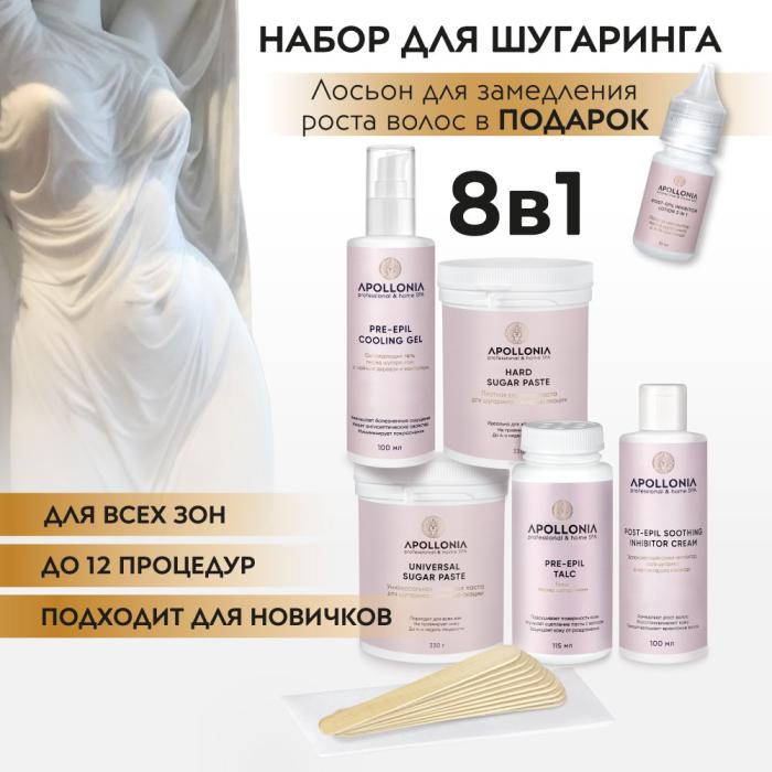 Многоразовый набор 8в1 для шугаринга поможет провести процедуру в домашних условиях, не посещая салона красоты. В набор входят: полоски для депиляции, деревянные шпатели, банки с сахарной пастой двух плотностей, лосьон для обезжиривания и очищения кожи, успокаивающие сливки-ингибитор, тальк, а также в подарок идёт лосьон-ингибитор 3в1, который предотвращает врастание волос, борется с уже вросшими волосами и замедляет рост волос. Регулярное удаление волос с помощью процедуры шугаринга сокращает количество во