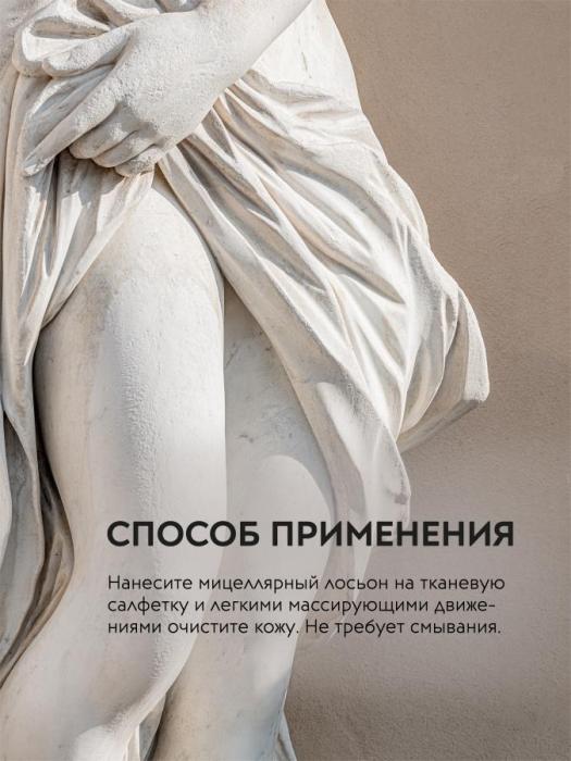 Способ применения: нанесите мицеллярную воду на тканевую салфетку и легкими массирующими движениями очистите кожу. Не требует смывания.