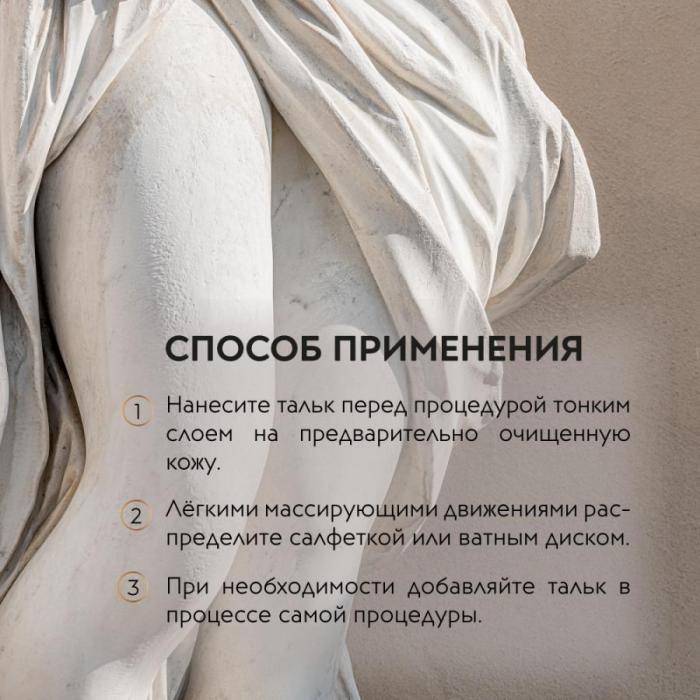 Способ применения: Нанесите тальк перед процедурой шугаринга тонким слоем на предварительно очищенную кожу и легкими массирующими движениями равномерно распределите мягкой салфеткой или ватным диском. При необходимости добавляйте тальк в процессе самой процедуры.