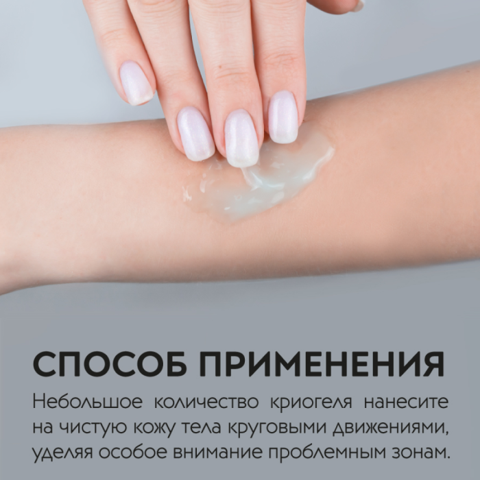 Криогель с охлаждающим эффектом активно борется с проявлениями целлюлита, усиливает микроциркуляцию, подчёркивает контуры тела. Кофеин и экстракт фукуса помогают устранить эффект "апельсиновой корки", а ниацинамид стимулирует обновление кожи и усиливает её увлажнённость. Мягкое охлаждение в сочетании с дренажным действием уменьшают отёчность и дарят эффект "лёгких" ног после тяжелого дня. Текстура геля быстро впитывается и легко распределяется по коже.
