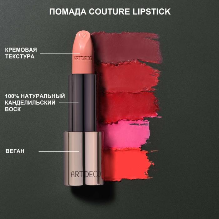 Создай свою собственную помаду! Комбинируя понравившийся оттенок помады ARTDECO Couture Lipstick и футляр для нее, выполненный в разных дизайнах, вы можете создать свою собственную помаду и выразить свой стиль. Чудесная кремовая текстура более чем на 80% состоит из ингредиентов натурального происхождения, она нежно скользит по губам, обеспечивая приятные ощущения после нанесения, делая кожу губ мягкой и ухоженной. Красивый насыщенный цвет в сочетании с сатиновым финишем визуально разглаживает губы, придавая им особую соблазнительность. Гипоаллергенная формула подходит для чувствительной кожи. Веган. Сменный стик помады предназначен для использования с футляром. Концепция сменных стиков экономична и экологична, вы не платите каждый раз за лишнюю упаковку и снижаете количество мусора. Пустой футляр и сменные стики помады продаются отдельно. VEGAN,CRUELTY FREE,ПЕРЕРАБАТЫВАЕМАЯ УПАКОВКА