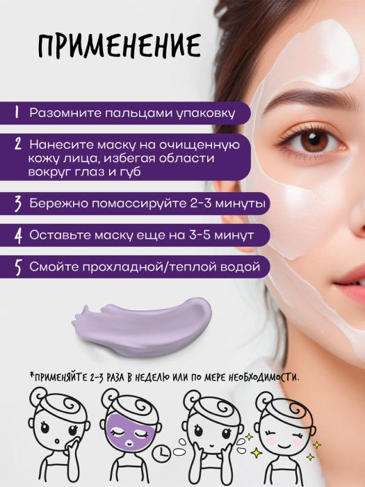 Разомните пальцами упаковку. Нанесите маску на очищенную кожу лица, избегая области вокруг глаз и губ. Бережно помассируйте 2-3 минуты. Оставьте маску еще на 3 -5 минут, смойте прохладной/теплой водой.