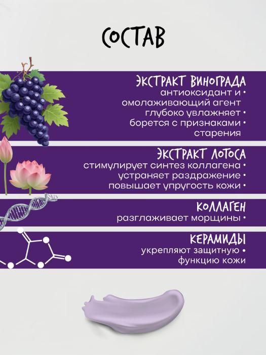 Массажная маска-йогурт "ВИНОГРАД" обладает мягкой и нежной текстурой, способствует увлажнению, смягчению и тонусу кожи, дарит здоровое сияние и молодость. Экстракт винограда - антиоксидант и омолаживающий агент, глубоко увлажняет и борется с признаками старения, экстракт лотоса стимулирует синтез коллагена, устраняет раздражение, повышает упругость кожи, коллаген разглаживает морщины, керамиды укрепляют защитную функцию кожи.